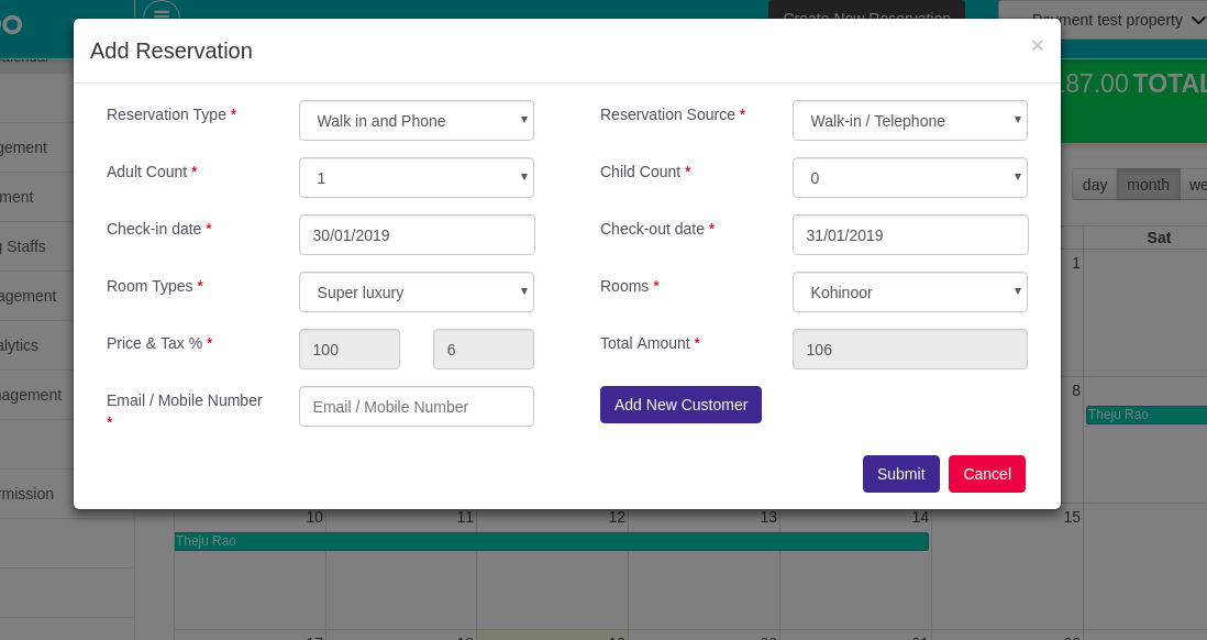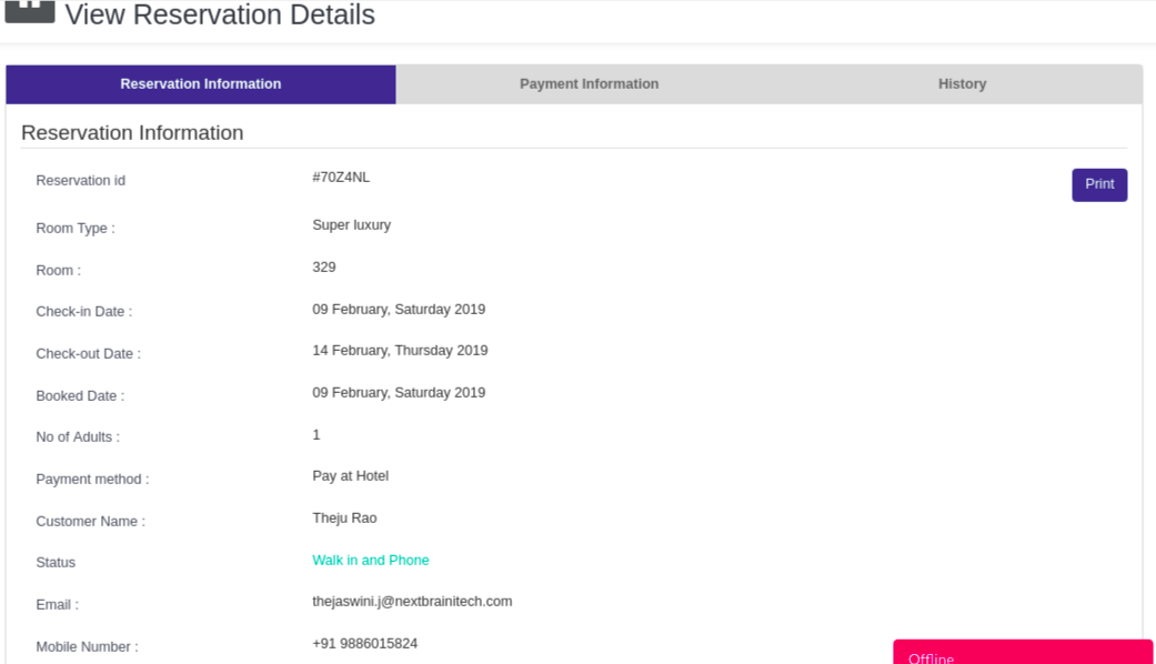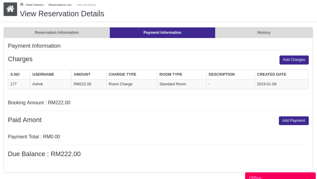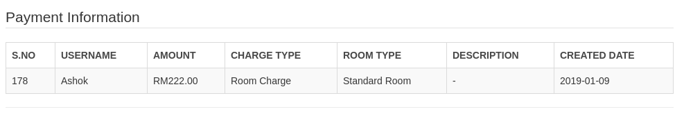 In payment information tab, hotel owner can enter the amount which user wants to pay after check in. Those added payment information you can view in the same tab and get the invoice by clicking on print button.