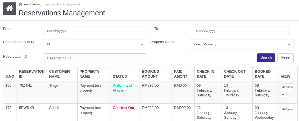 Using filters from, to date or reservation status or property name or reservation id, owners can check the reservation booking list.